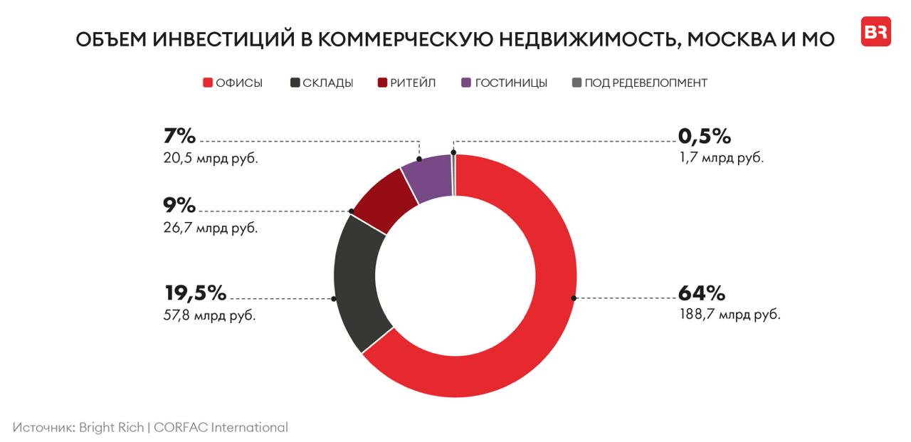 В разрезе сегментов коммерческой недвижимости инвестиции в Московском регионе распределились следующим образом: