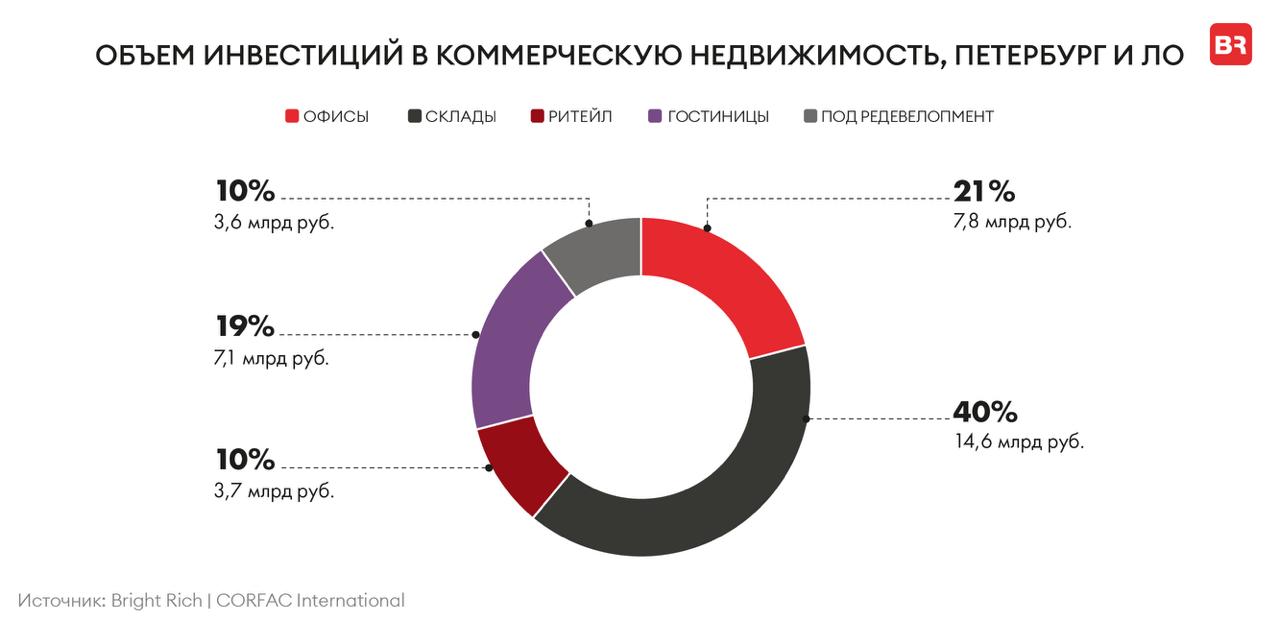 В разрезе сегментов коммерческой недвижимости инвестиции в Петербурге распределились следующим образом: