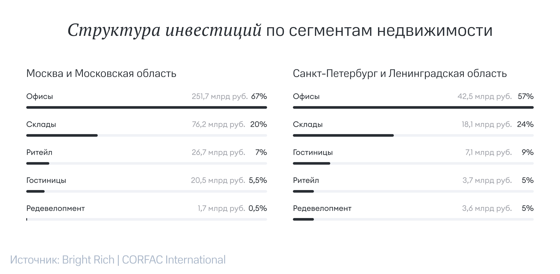 - Офисы: 251,7 млрд руб. или 67% (+6 п.п. за год)
